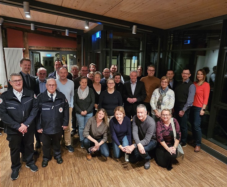 Die Spenderinnen und Spender bei der Ehrung im Zunfthaus mit Viktor Harder, DRK-Schatzmeister (1. Reihe, v.l.), OB Simon Gröger, Dr. Helmut Weller, kommissarischer Leiter des DRK Ortsverbands Radolfzell und Benjamin Thämlitz, stellvertretender Bereitschaftsleiter DRK (Erster in der 3. Reihe). Bild: Stadtverwaltung
